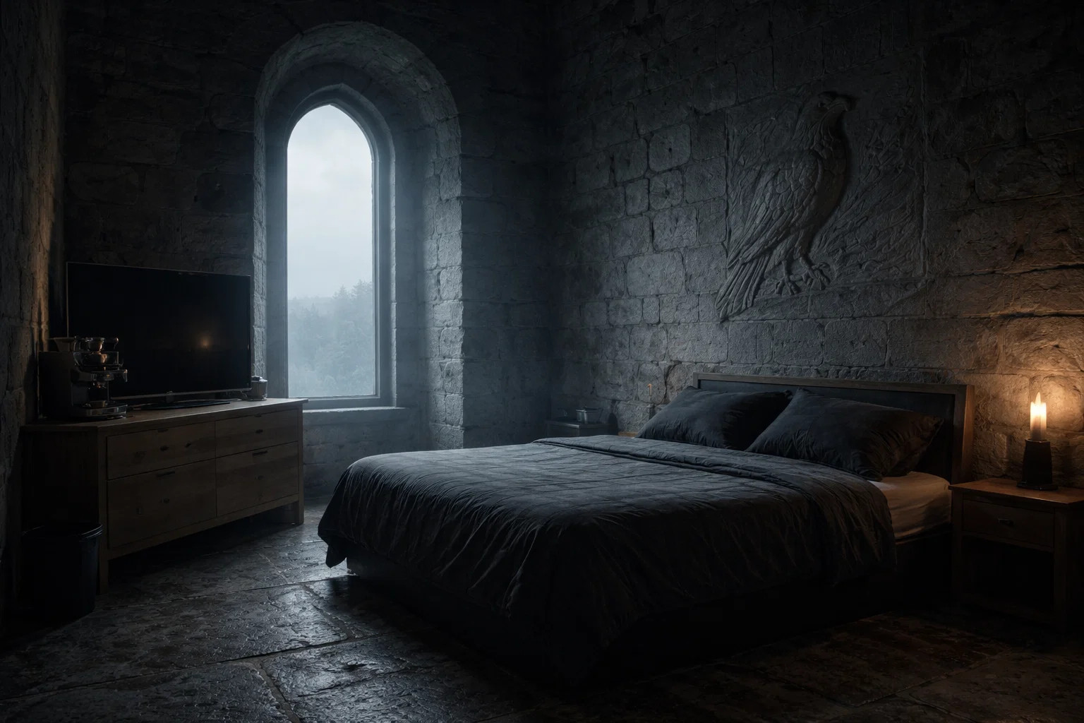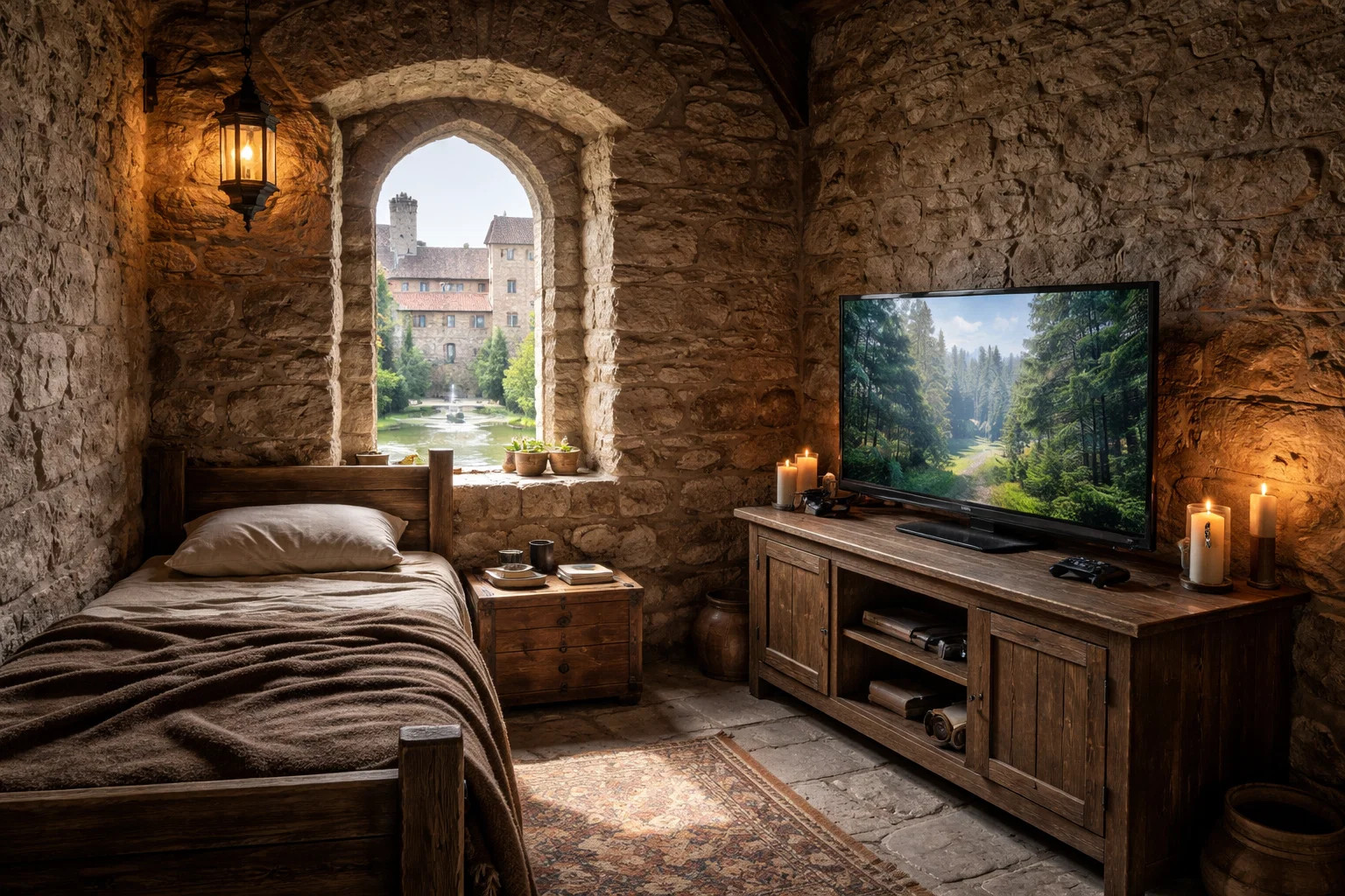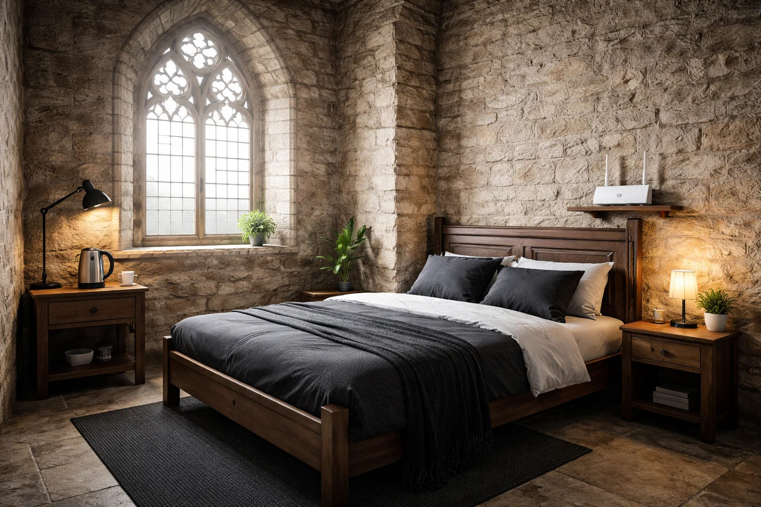 Pokojná komnata s kamennými stenami, kde sa