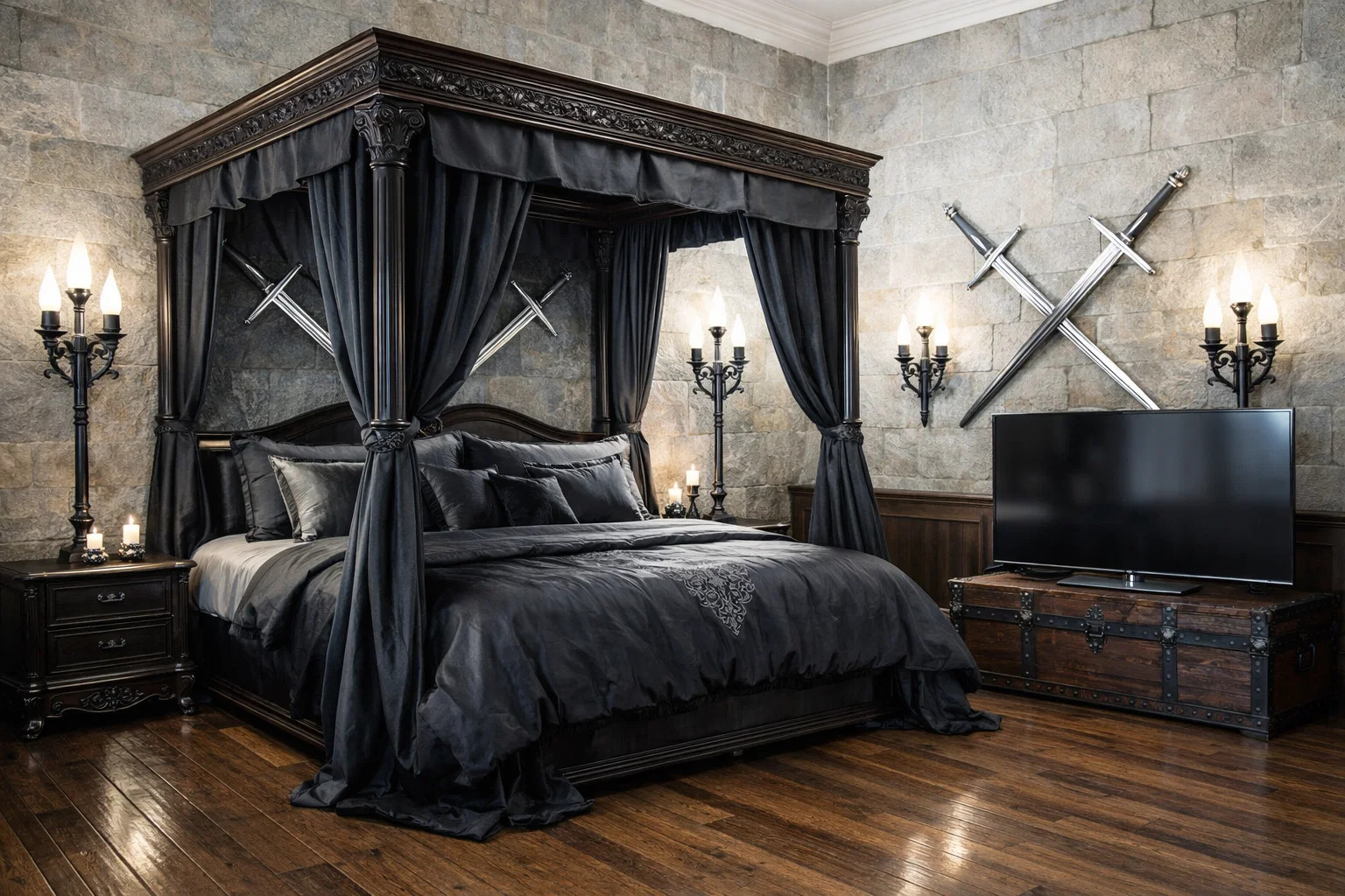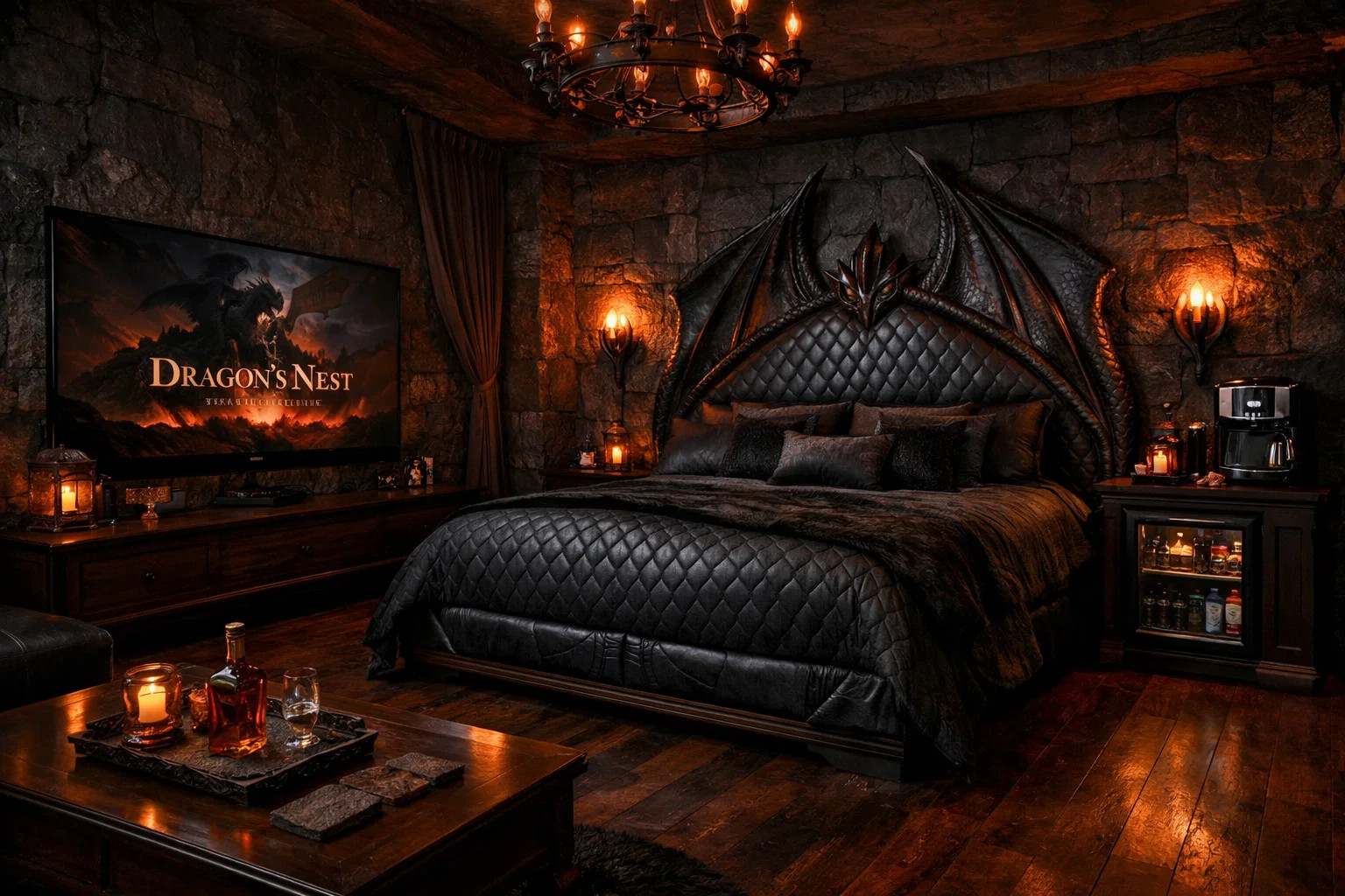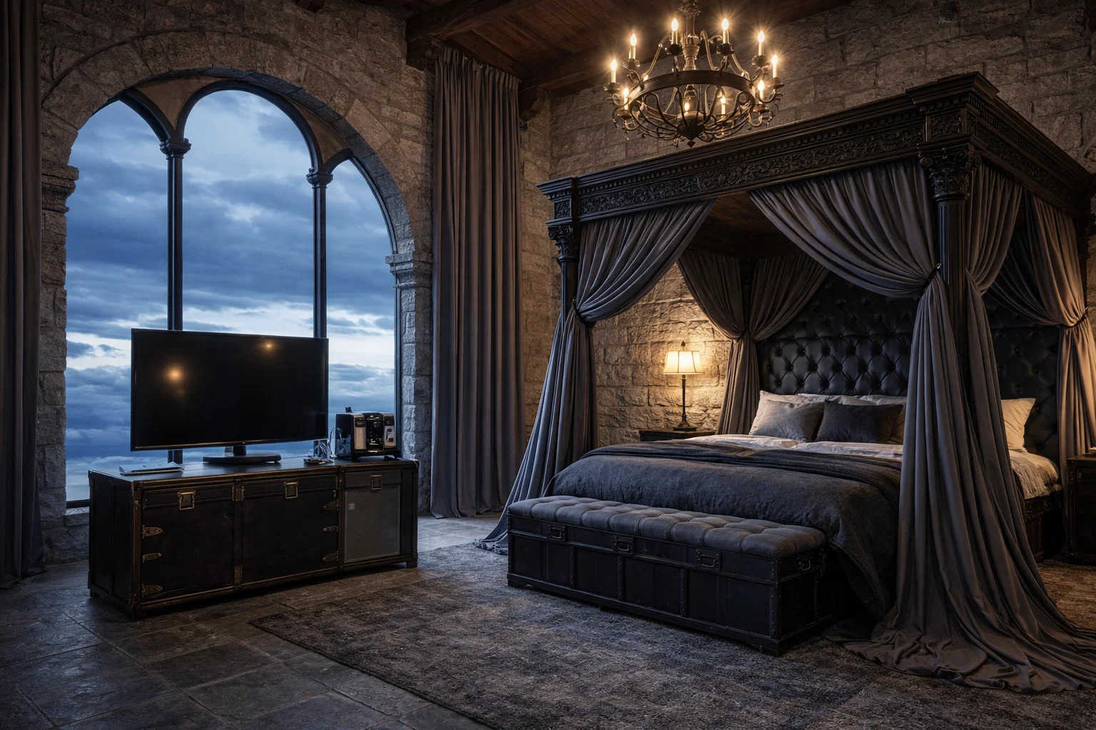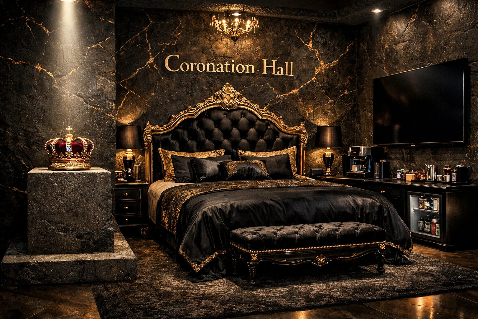 Exkluzívna komnata s dramatickou atmosférou.